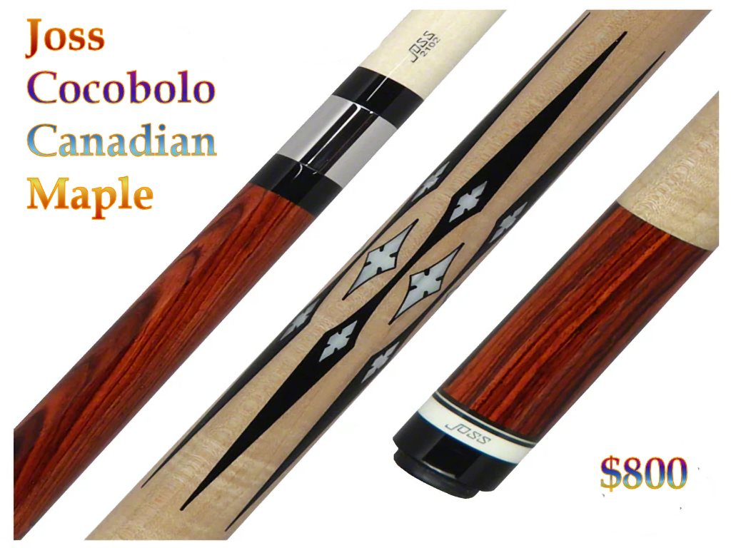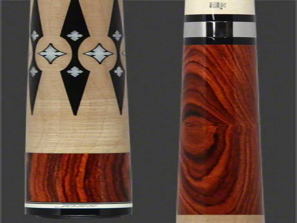 The Joss 20149C features a highly figured Cocobolo front and rear. The Cocobolo is rare wood and was selected for its fine grain pattern, each cue will be unique because of the grain. The wrap is high figure curly maple from Canada and was hand-selected to give this cue a lot of flash. The ebony black with pearl inlays just adds to the flash making this cue a standout! The Joss highly polished stainless-steel joint with a unique serial number. The rear on this cue has an old-style Hoppe butt plate. The simple clean lines and the wood used in this cue make it special.