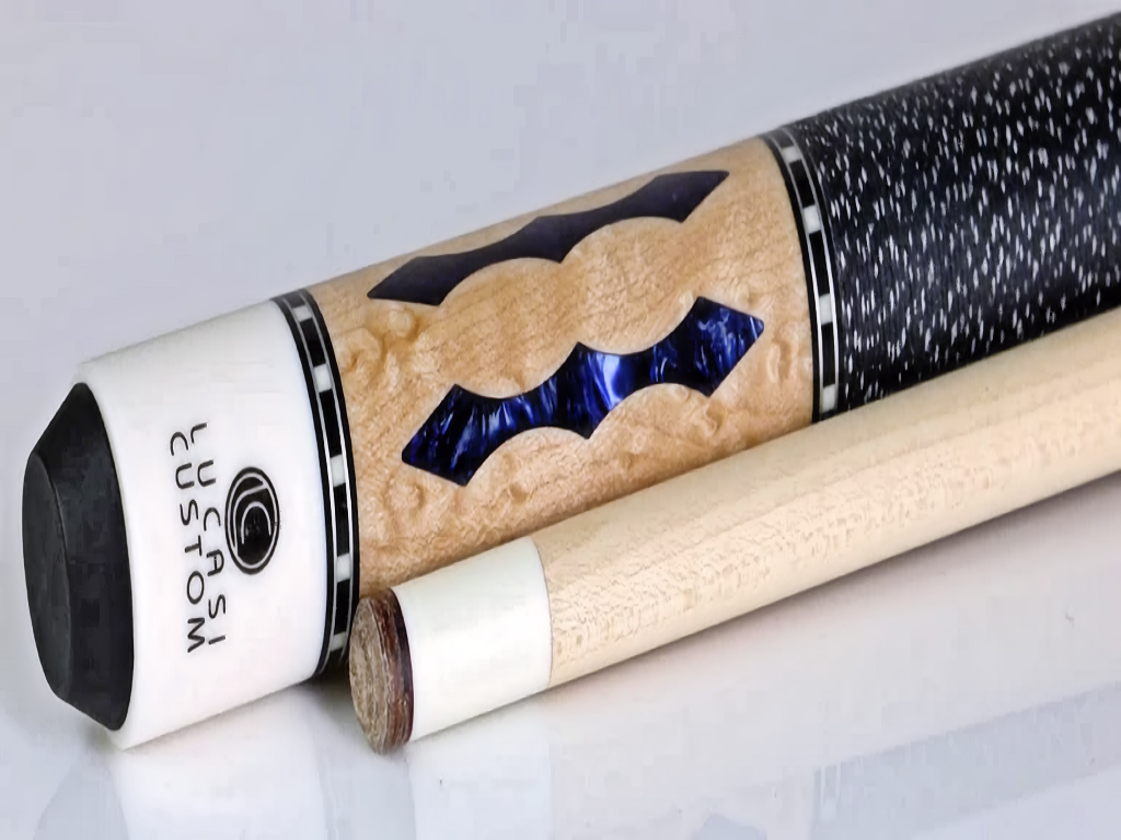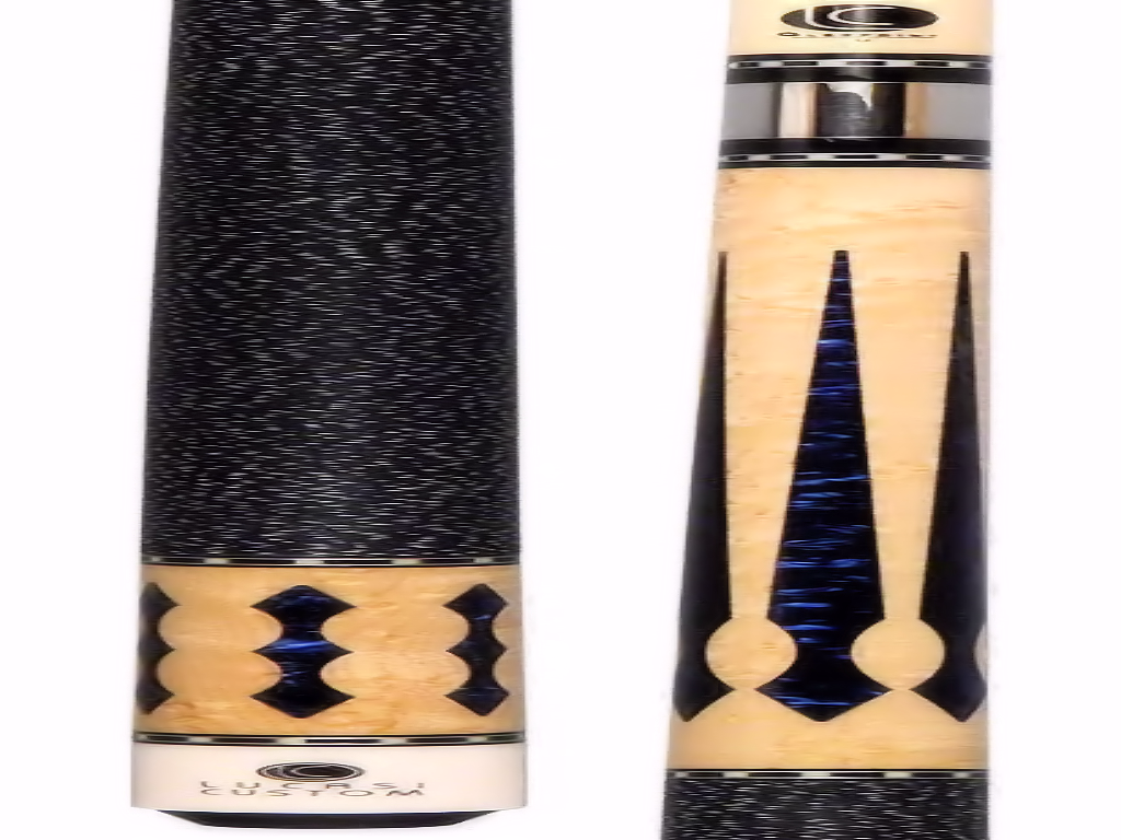 Lucasi LZ2004NB Zero Flexpoint Pool Cue is made of super birdseye with natural stain with floating six point blue luster inlays. Comes standard with black and white linen wrap and uni-loc joint.