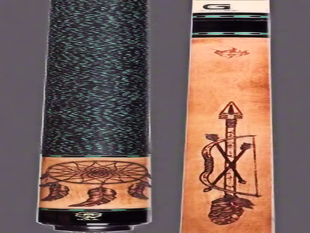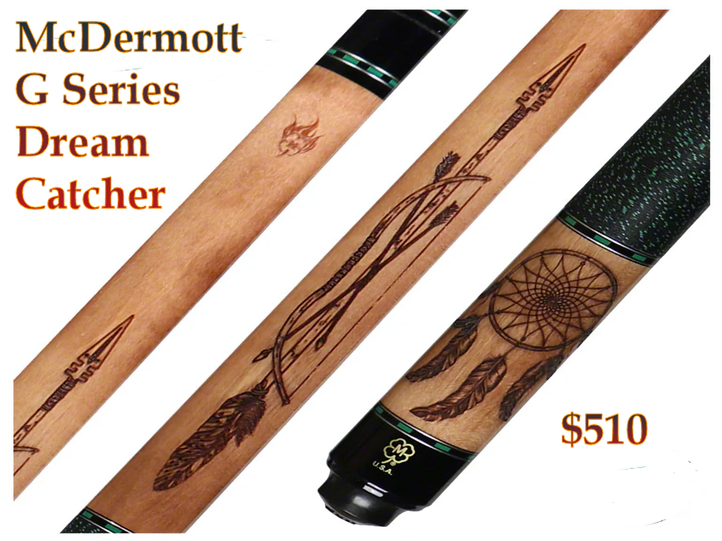 McDermott Pool Cue Wildfire model G337 Cue. This cue has a Michigan Walnut stain Maple forearm with 3-D dreamcatcher wood burning image and a bow and arrow image on the butt sleeve. A Wildfire 3-D image carvings on the butt sleeve and forearm with 5 sets of index rings. The McDermott Wildfire cues show advanced wood burning technology with 3 dimensional image carving and 360 degree rotational cutting. The McDermott G337 comes standard with the G-Core shaft.