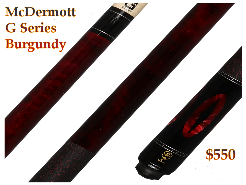McDermott Pool Cue model G212 has a Birdseye Maple forearm with Recon Ebony sleeve and 4 Italian pearl inlays with Burgundy European organic stain. The McDermott G212 comes standard with the G-Core shaft.