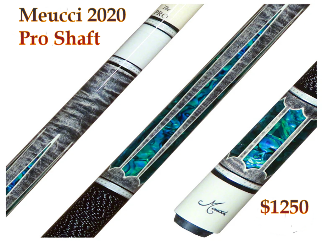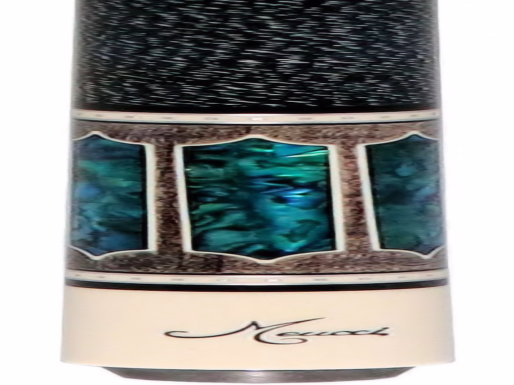 Meucci 2020 Blue Pearl Pro Pool Cue forearm is a grey stained curly maple. The forearm is inlaid with 6 authentic blue points framed in white. The butt sleeve consists of 6 blue pearl floating window inlays framed in white a stitched collar matching the forearm. Completing the cue is a Urethane coated black and white Irish Linen wrap and Meucci "The Pro" 12.5mm Shaft.